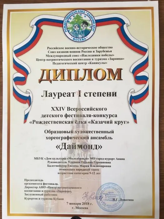 Одним из участников этого большого действа стал и коллектив из г-к Анапа: образцовый художественный хореографический коллектив «Даймонд» (МБУК «ДК «Молодежный», рук. – Удачина Татьяна). Ансамбль завоевал Лауреата I степени в номинациях «Народный танец» и «Современная хореография», а также награду этого же значения получили и наши звездочки-солистки: Аметова Эльмаз и Федоренко Ксения.